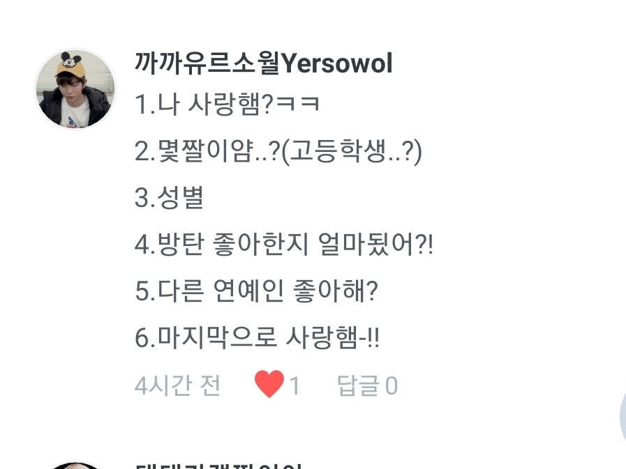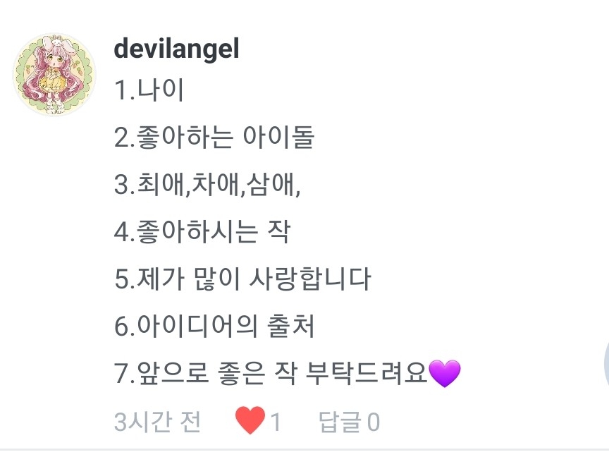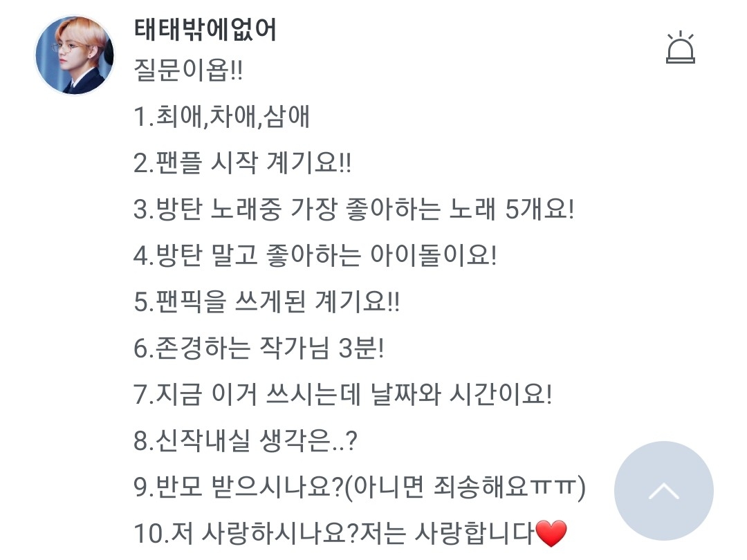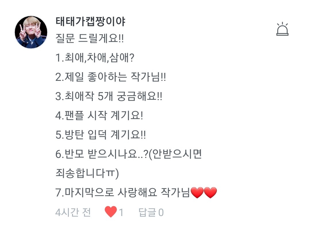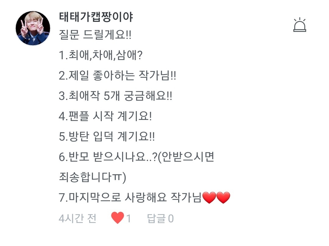 1.낭랑 17세요!ㅎ 2.현재는 방탄밖에 안팝니당ㅋㅋ 3.태태,찐,융기요! 4.사랑해줄게 나쁘게 좋아합니당ㅎ 5.저두요❤❤ 6.제 오른쪽 두뇌에서 나오죵ㅎㅎ(제 경험을 바탕으로 쓰기도 하구요!) 7.저도 잘부탁드립니다~❤