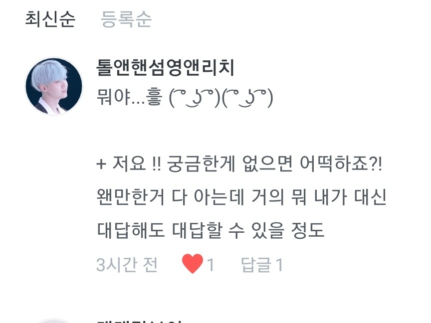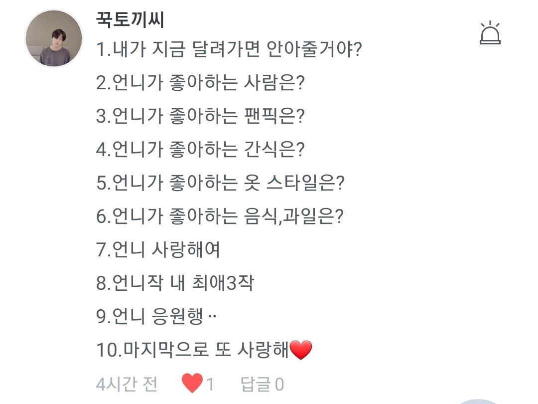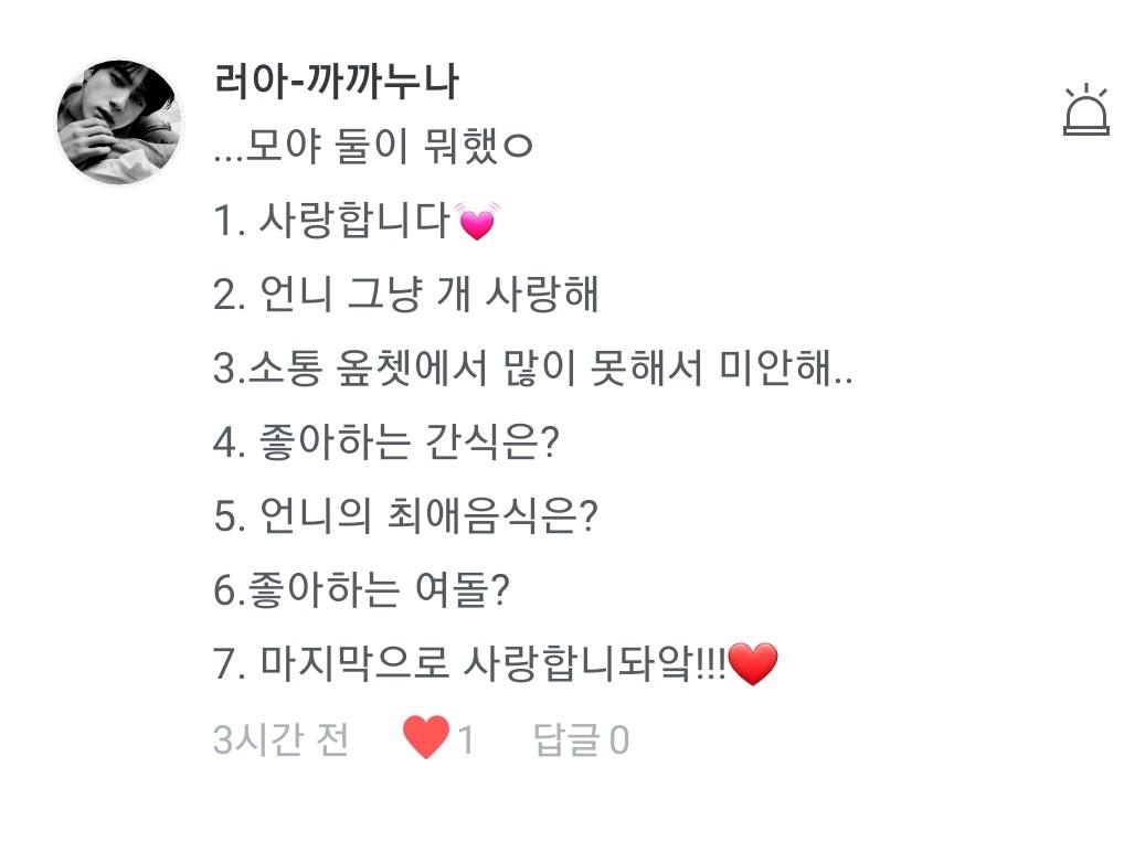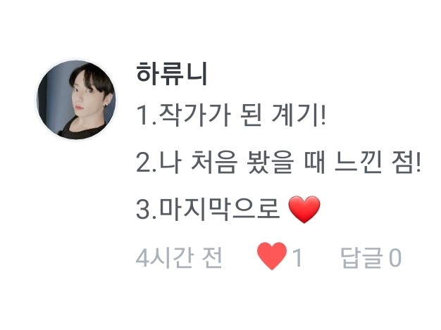 4.음..단순히 빙의글을 보고싶어서 였던거 같아요 5.아는형님에 나온거 보고 바로 입덕했다죠>< 6.반모는 언제나 환영입니다! 7.저두 사랑합니다❤