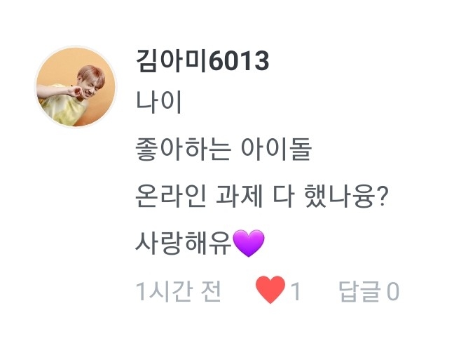 1.낭랑 17세요ㅎ 2.현재는 방탄만 파요! 3.과제가 없지유~흐흫 4.저두여❤
