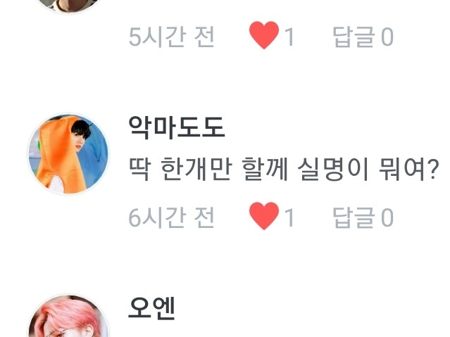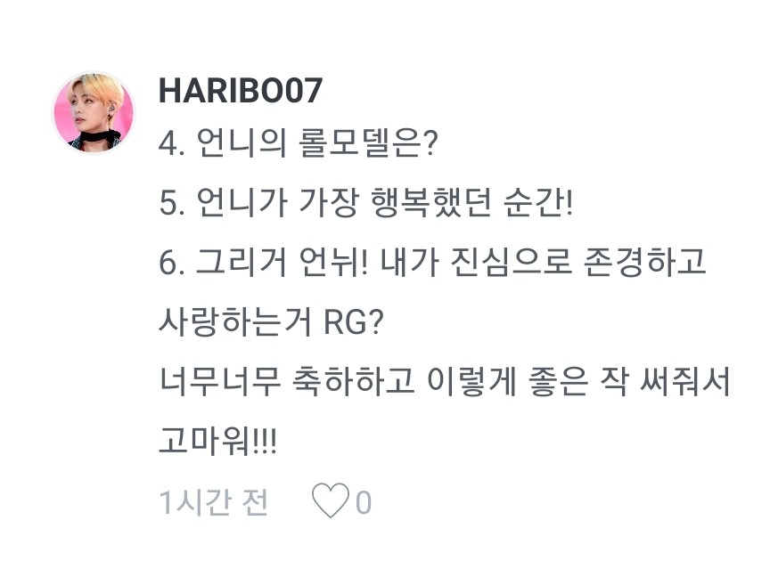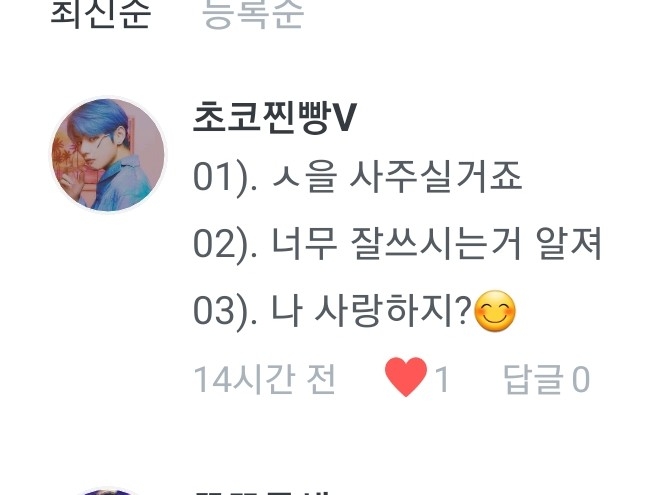 1.태태,찐,융기 순이요! 2.빙의글 보고싶어서요ㅋㅋ 3.럽마셀,heartbeat l,so what,소우주,on 좋아합니당 4.한때 버디였어요(여자친구) 5.그냥 질렀어요..허헣 그래서 나온게 저 오늘 전역이지 말입니다ㅋㅋㅋ