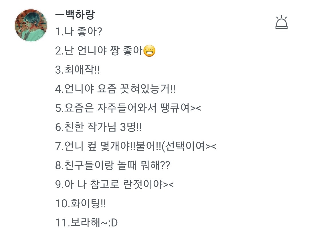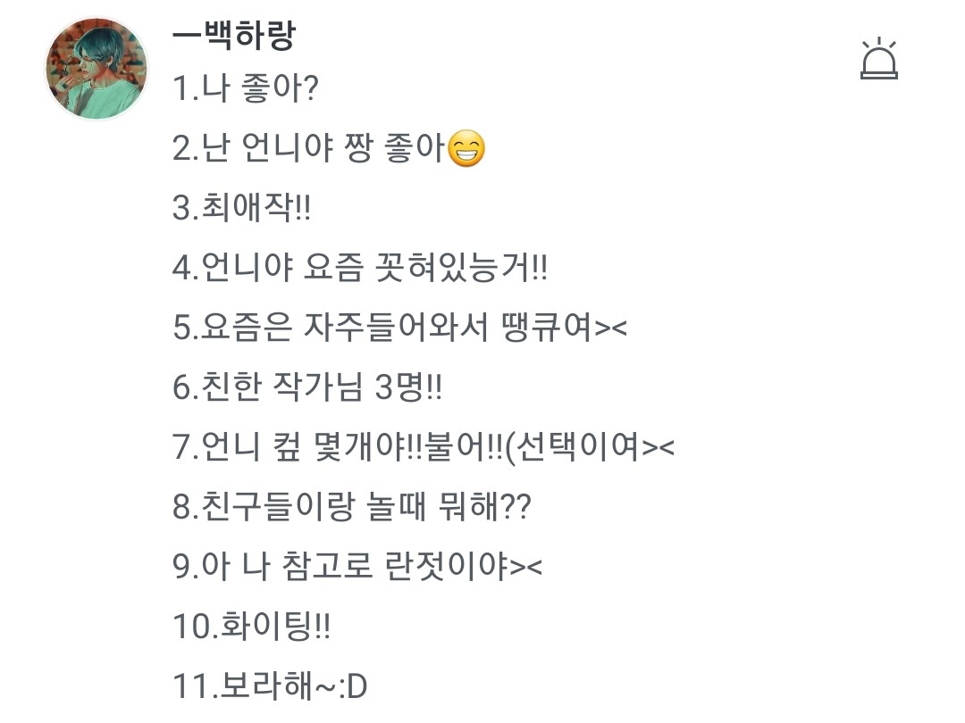 1.당연하징!! 2.코코콬 3.사랑해줄게 나쁘게 4.학교에서 애들이랑 바니바니 하는거ㅋㅋㅋ 5.아잇 저두연~ 6.요즘은 망개떠억작가,채융,하루살이참새 대작가님들하고 친해!흫