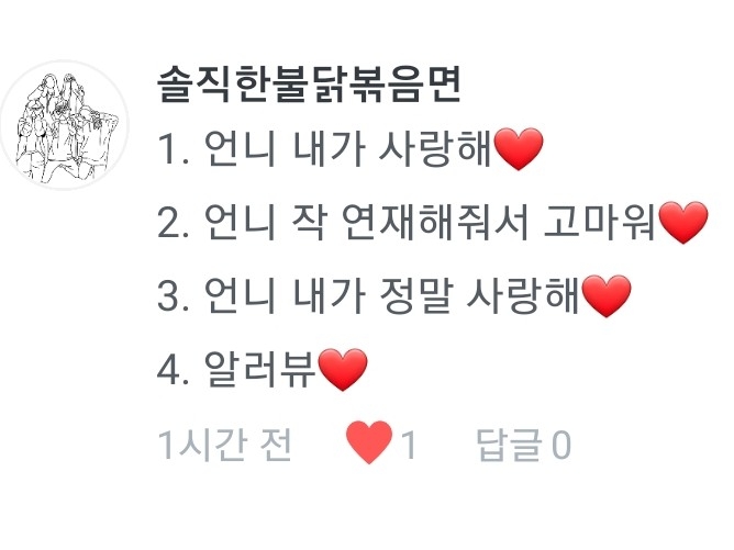 1.나도 사랑해❤ 2.내작 봐줘서 고마워ㅎ 3.나도 사랑한다구우~ 4.알라뷰❤