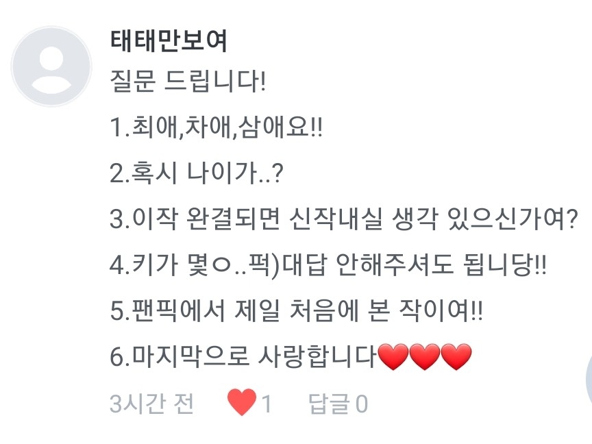 1.태태,찐,융기요! 2.낭랑 17세임당ㅎ 3.흠..지금 생각해놓은 작이 있긴합니다!가서 구독 꾸욱~ㅎㅎ 4.163이요! 5.일진과의 관계요ㅎㅎ 6.저두요❤❤