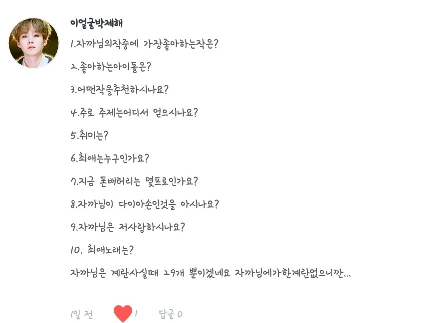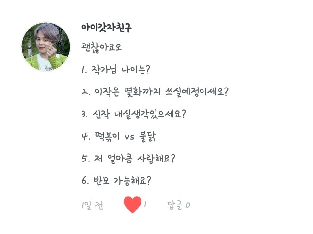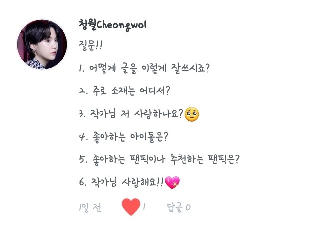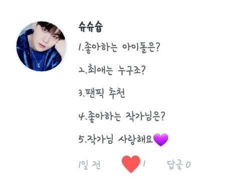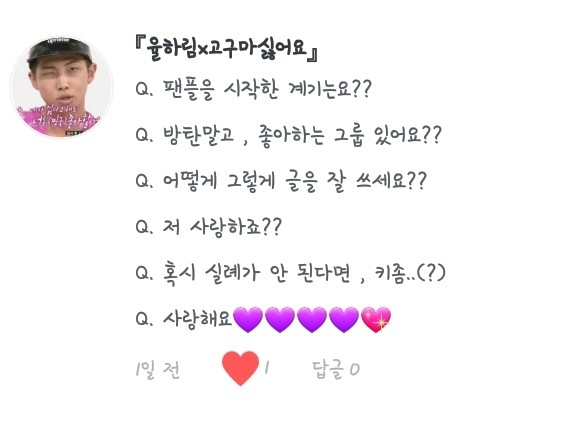 6. 최애 입덕이라... 제가 외국에 살 때라 덕질 그리고 케이팝 그딴거(?) 모를 때였던지라... 친구 추천으로 좋아하게 되었는데..(생략) 그냥 딱 봤는데 와 잘생겼다! 하다가 5년째 좋아하게 되었답니다ㅎㅎ...