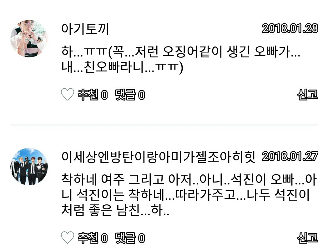 이세상에서방탄이랑아미가젤좋아히힛님, 저도 남친...큭...눈에서 땀 이... 아기토끼님 저도 오징어같은 오빠있습니다
