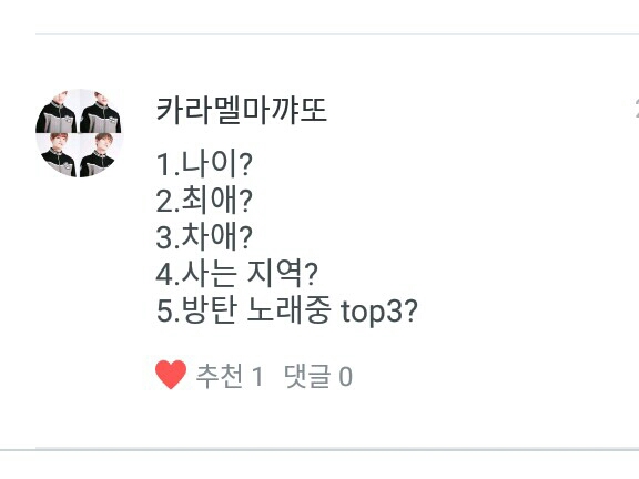 1. 나도 13살 알건다 알아!! 2. 지민오빠요♥ 3. 태태오빠요♥ 4. 푸른섬 제주도! 5. 음...이건 1.DNA♥ 2.뱁새♥ 3.고엽♥입니다♥