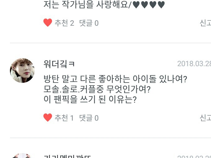 워더깈ㅋ님♥ 방탄 말고는 레드벨벳, 아이콘이 있죠. 하지만 방탄은 다른 그룹들관 비교도 안되게 유독 좋아하죠♥ 그리고...이 팬픽을 쓰게 된 이유가 다른 분들 팬픽보면서 '아, 나도 팬픽 써 봐야겠다.'라고 생각하면서 쓰게 됬어요♥
