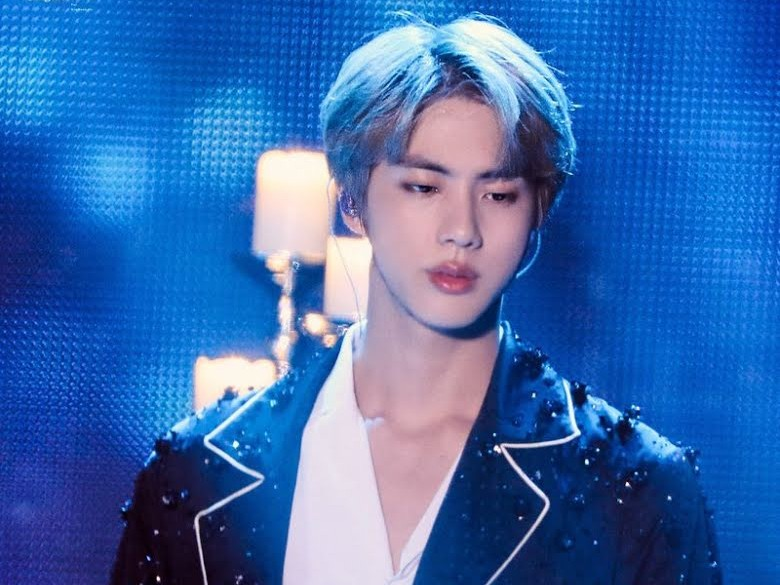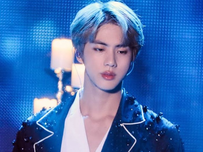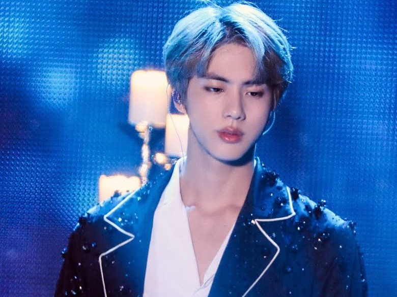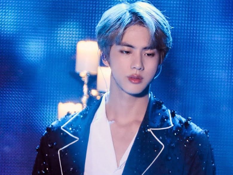 Jin looking towards jimin who crying but when jimin Heard your voice stop crying but tears are rolling on cheeks