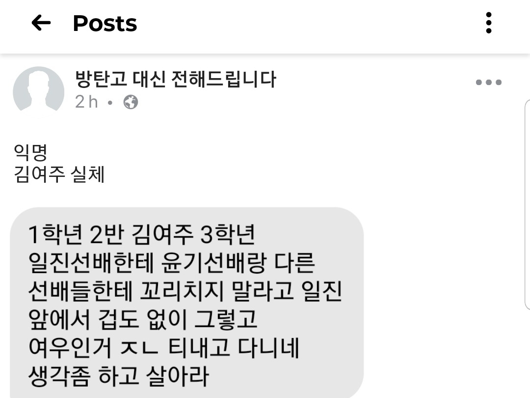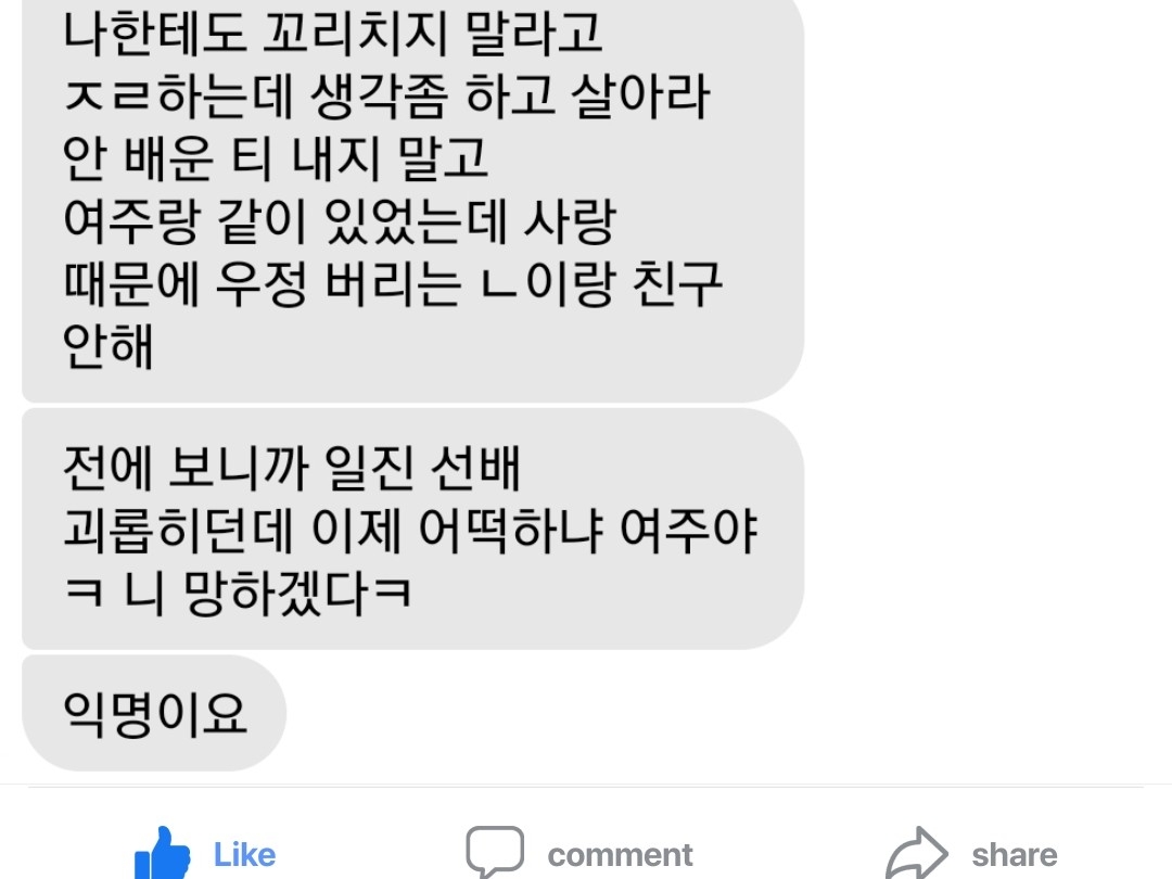 "어우 뻔뻔하게 학교에 고개들고 오네 ㅋㅋㅋ"