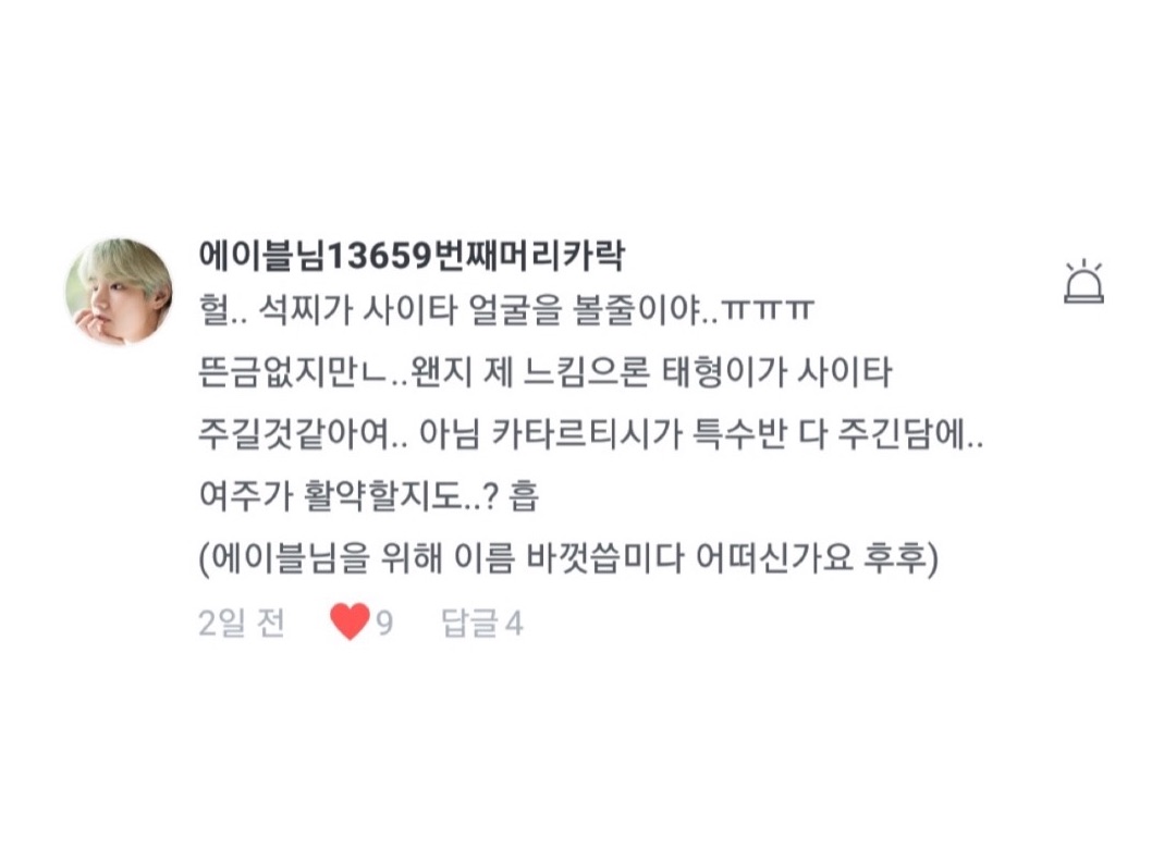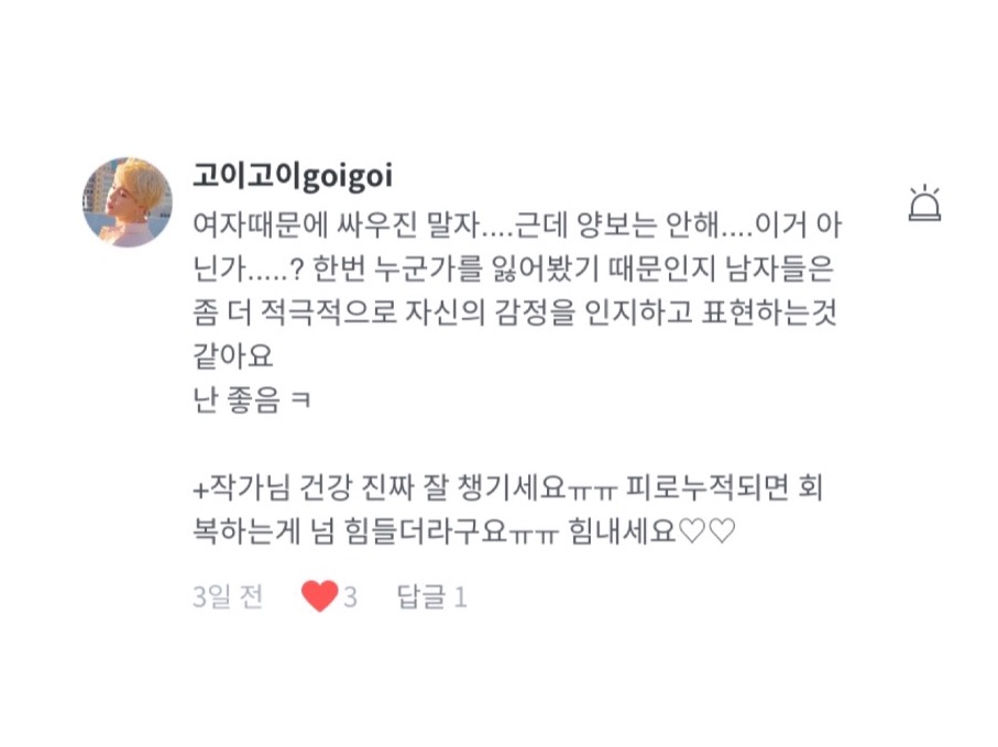 고이고이 님이십니다! 석진이 감정을 잘 설명해주신 분들이 또 계셨는데, 고이고이 님 마지막 말에 '난 좋음 ㅋ' 이게 너무 강렬했어요 ㅋㅋㅋㅋㅋㅋㅋㅋ