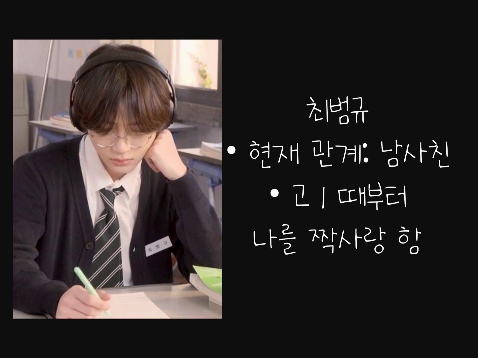 여주야… 나 너 좋아하는데… 남친 생겼다면서… 고1때부터 너 좋아했는데.. 유학을 가버려서… 고백을 못 했네..