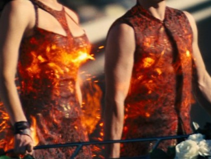 시나는 우리가 탄 마차가 거리로 나서기 직전에 오렌지색, 노란색, 붉은 색으로 된 펄럭이는 망토와 그에 맞춘 머리 장식에다 불을 붙일 계획이다.