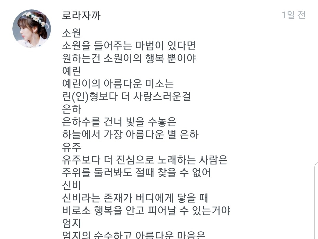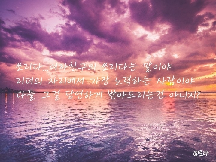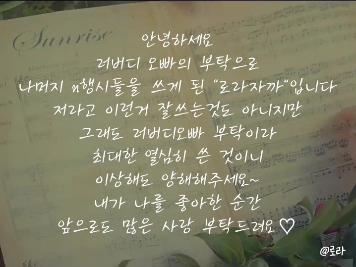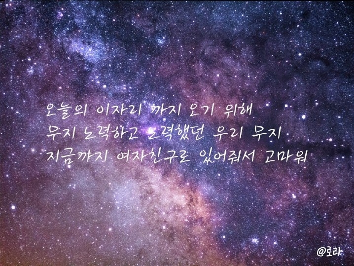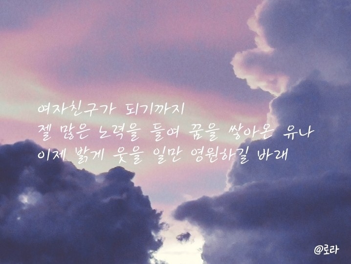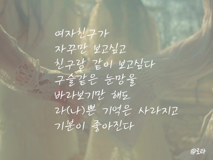 로라야 수고했어!! 쫌 갑작스런 부탁이었는데 응해줘서 고마워!! 그리고 너 진짜 N행시 잘쓴다ㅠㅠ 진짜 하나도 안이상해!! 너무 고마워ㅠㅠ 사당해!! (사랑해 못하는 스타일)