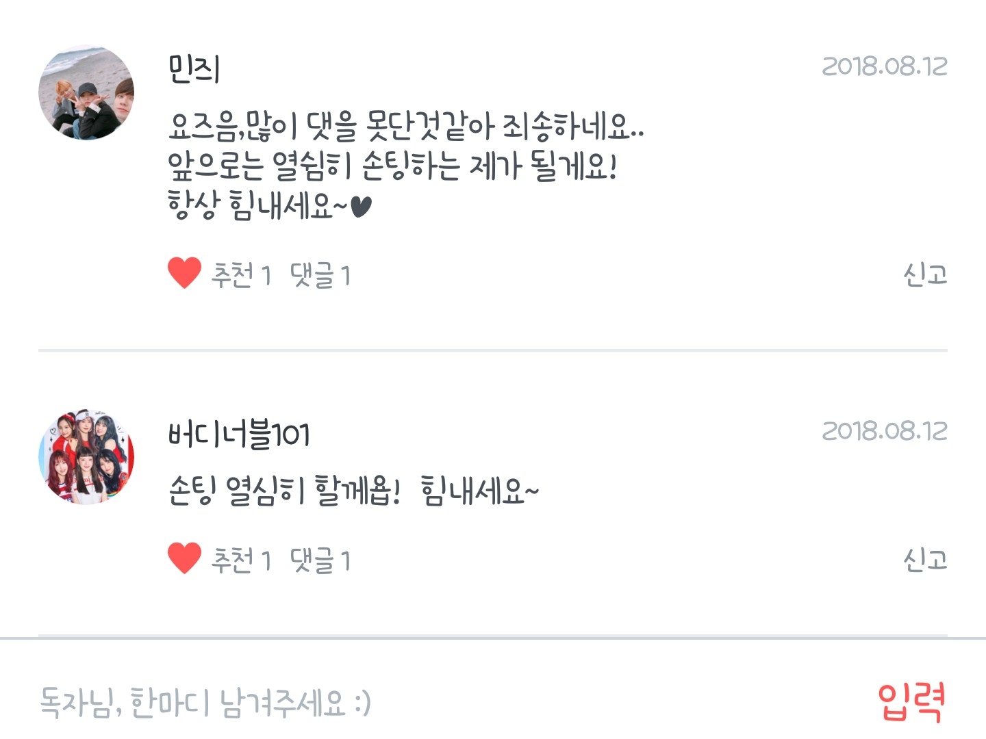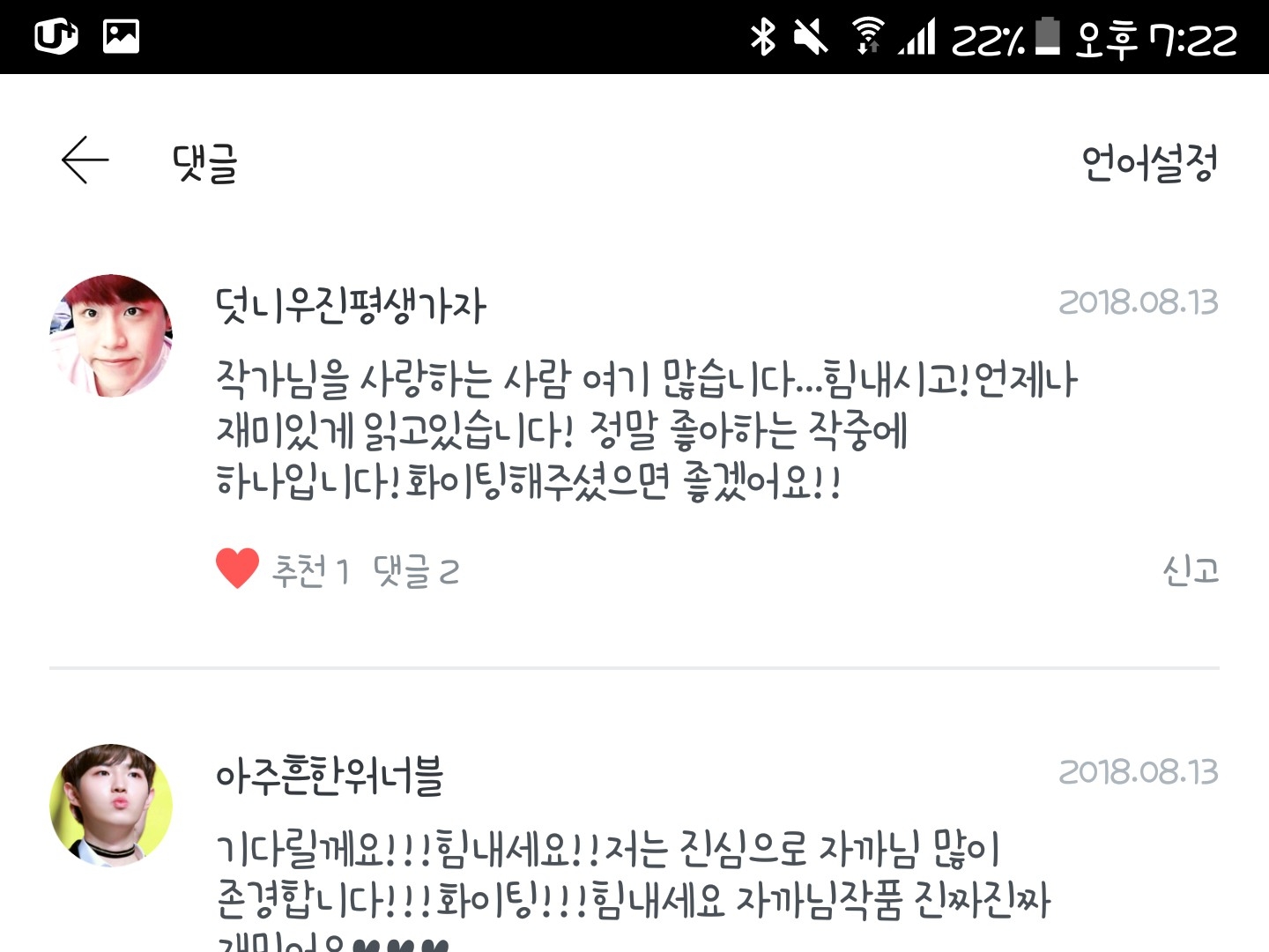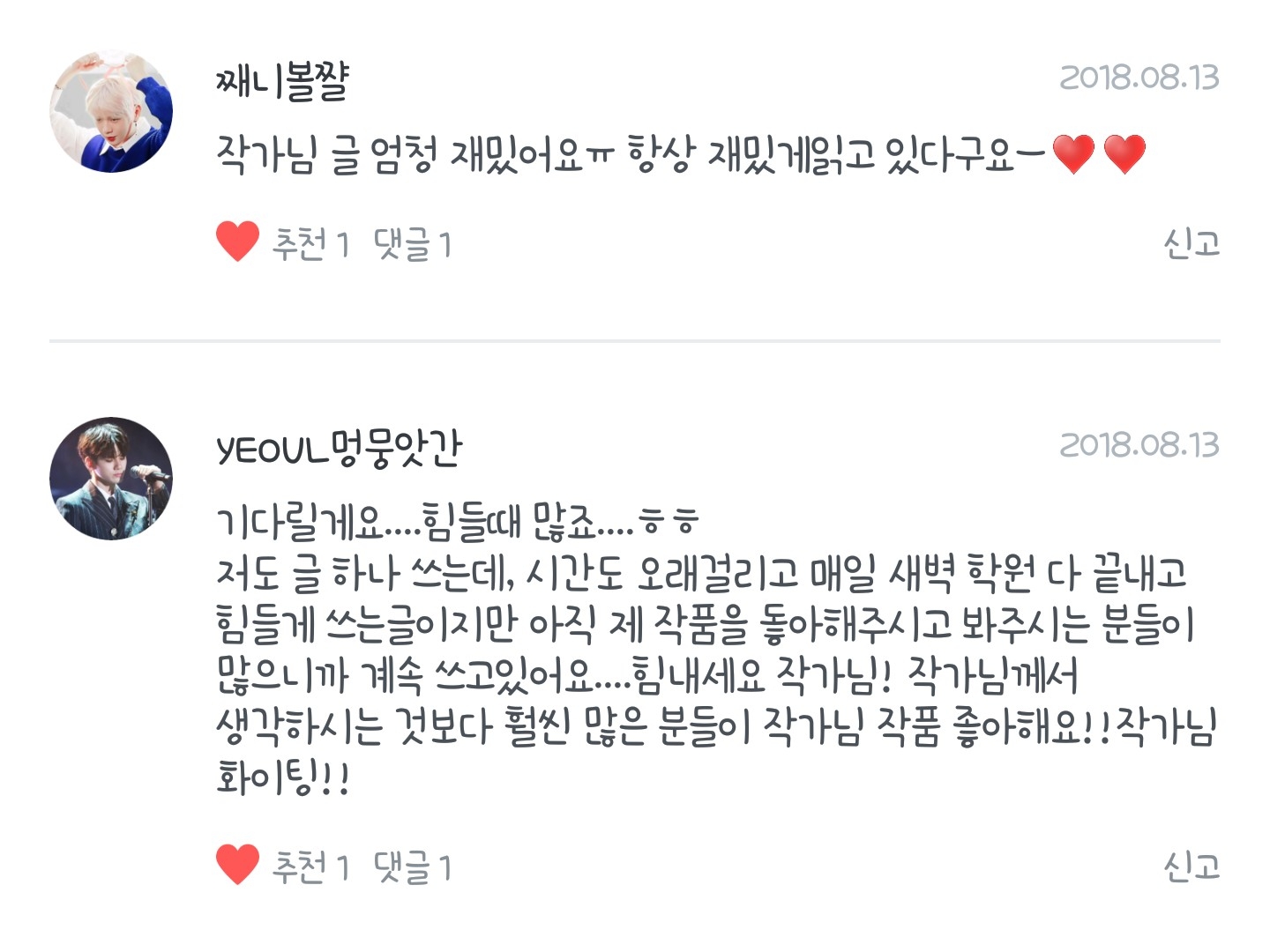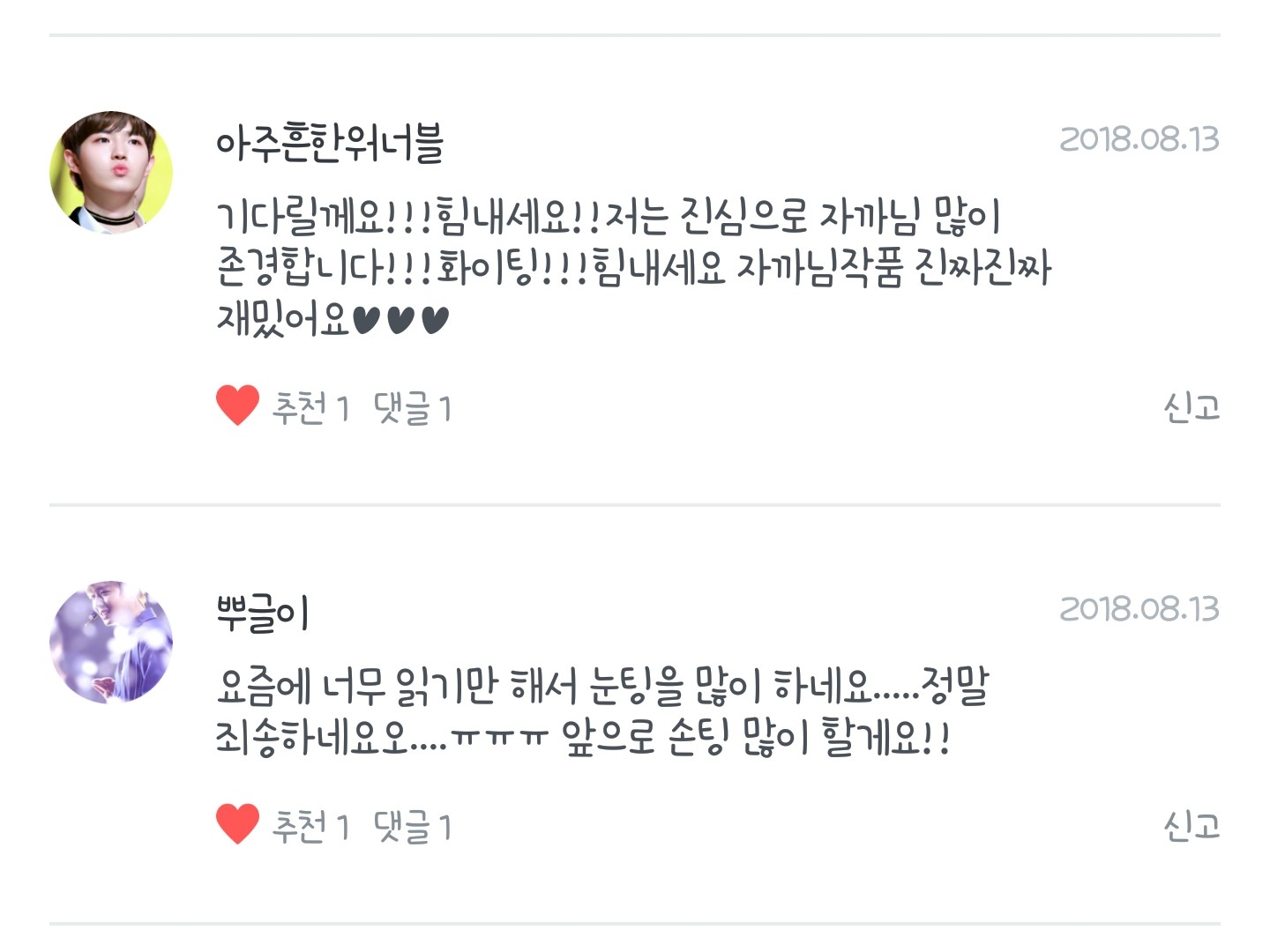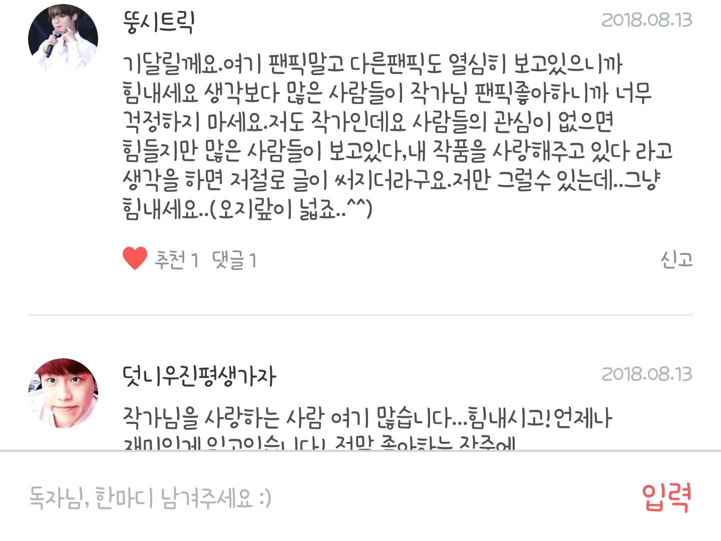 하나같이 응원과 사랑으로 똘똘뭉친 아름다운 말씀들만이 제 팬픽에 가득찼더라고요