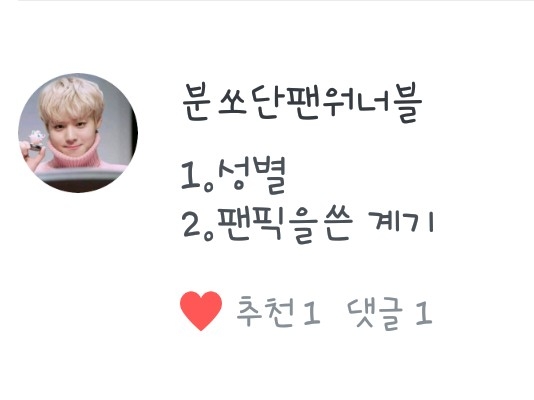 <분쏘단팬워너블>님! 성별은 여자이구요! 팬픽을 쓰게된 계기는! 제가 진짜로 친한 친구가 비쥬얼팬픽을 보여주었어요! 근데 친구가 ''쓸 수도 있어!'' 라고 해서 재미삼아 했는 데 인기가 많아졌어요!