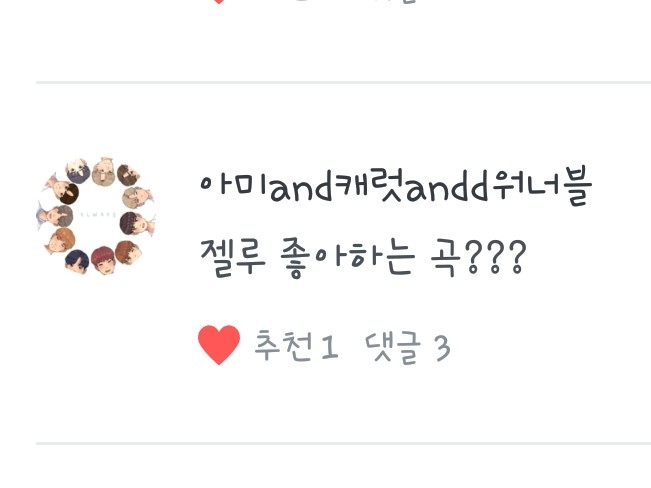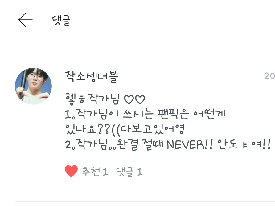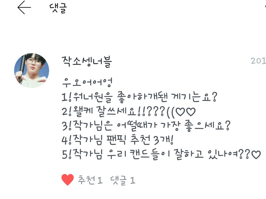 <작소셍너블>님! 추천팬픽 3개! 위를 참고해 주셔도 되고요>< <밍스님- 일진과 과외라니?!> <사랑하자워너원님-그냥 아는 오빠라구요> <대휘애각님- 좋아해??아님 사랑해??> 입니다! 캔디분들 잘하고 있나여?는 잘하구 계세요! 근데 댓글이 많길..