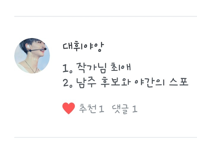 <작소셍너블>님!왤케 잘 쓰냐구요...? 제가 약간 글쓰는 걸 좋아해서 그래여... 하핳...어떨때가 가장 좋으냐구요...? 저는 댓글 마니마니 달리고! 조회수 (구독) 이 많이 늘었을 때 가장 좋아요!