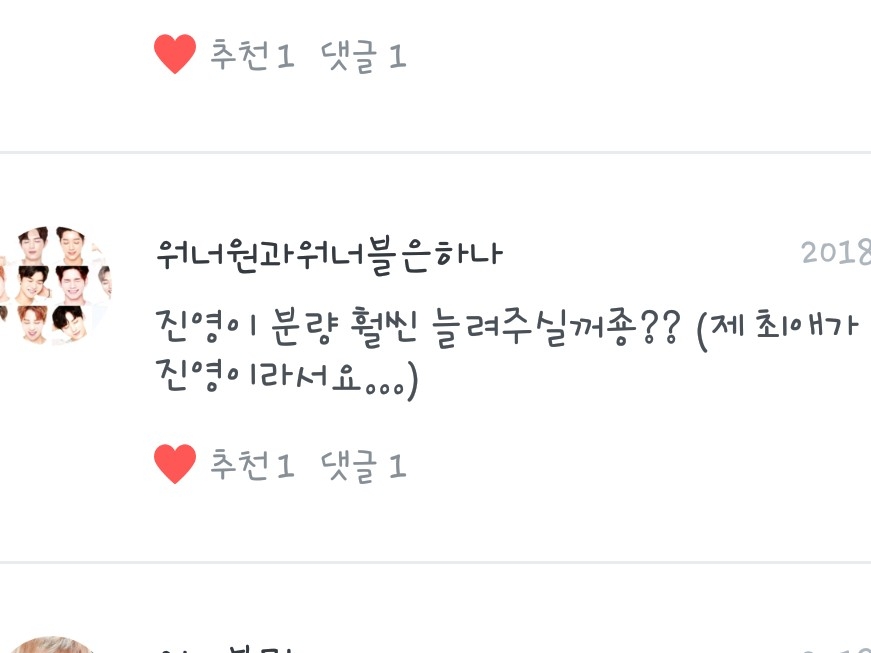 <워너원과워너블은하나>님! 진영이 분량은 잘 챙겨서 올게요! 아님 늘려 보려고 노력해볼게욧!