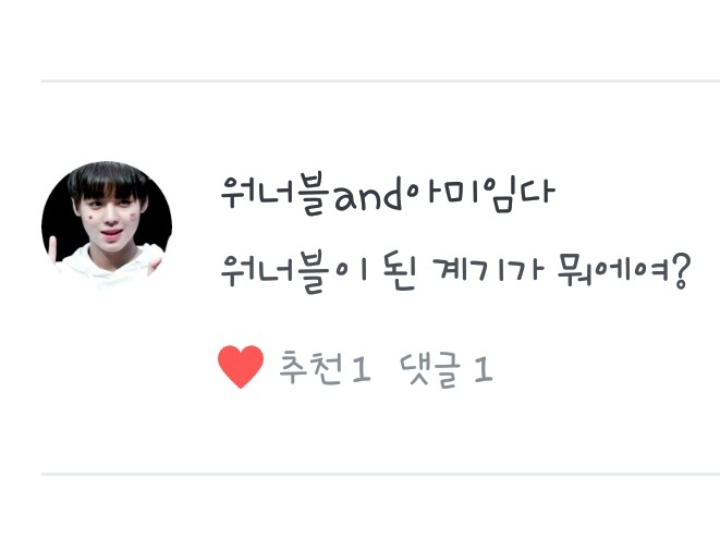<작소셍너블>님! 워너원을 좋아하게 된 계기는.. 한참 엑소를 좋아하고 있었는 데! 에너제틱이란 노래를 듣고 나서 입덕!했다가 탈덕했다가 너무 잘생기고 노래가 중독성 있어서 입덕했어요!