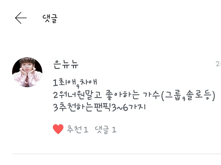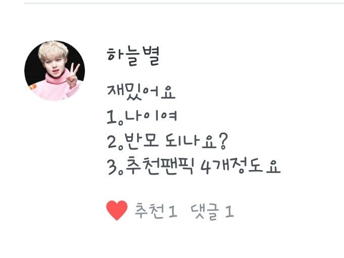 <은뉴뉴>님! 최애는 대휘 지훈이 입니다!차애는 진영이!입니다! 워너원말고 엑소도 좋아하죠! 추천 팬픽은 다른 분들 참고요><