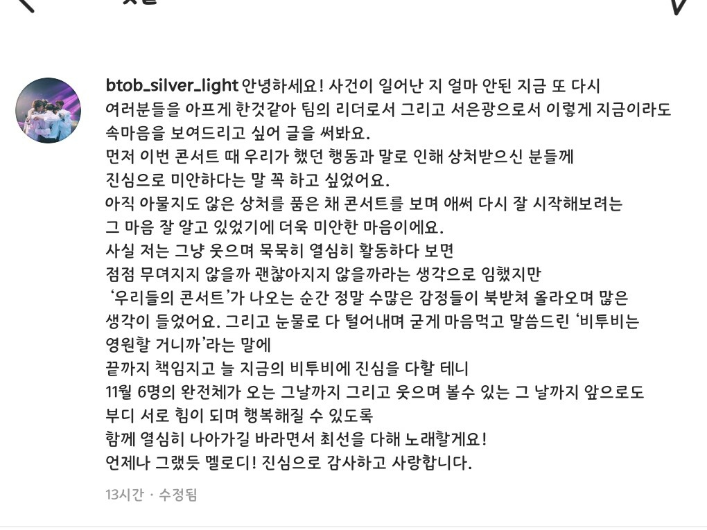 이번에도 미안해하고 6명의 완전체라고 하는 은광 오빠의 말에 또 눈물 한바가지 쏟았네요ㅠㅠ
