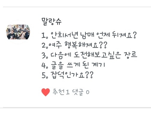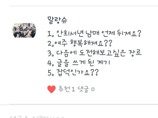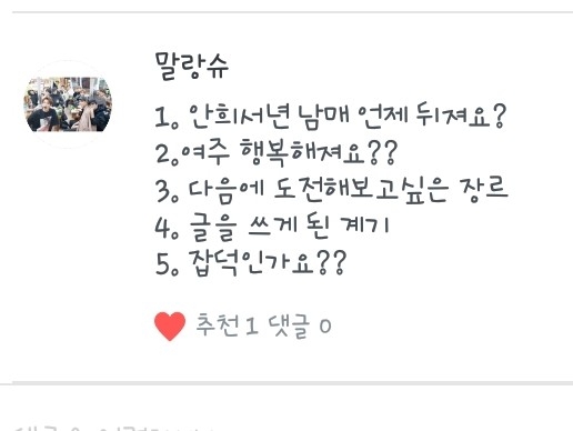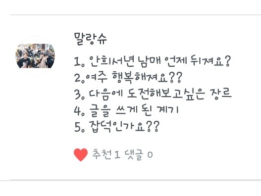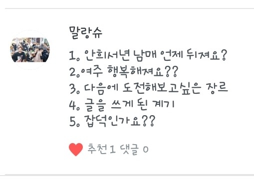4. 항상 다른 작가님들 작만 보다가 나도 한 번 도전해볼까라는 생각도 들었었고 제가 소설쓰는걸 좋아해서 도전해보게됬어요!ㅎ