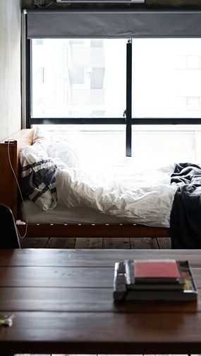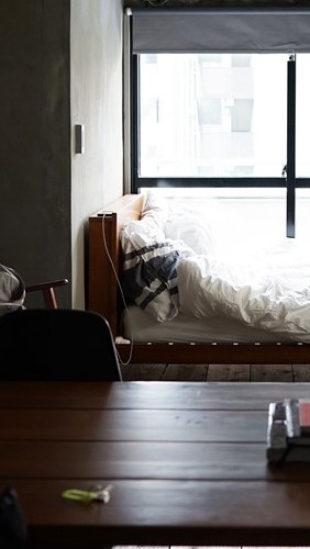 저기 침대에 앉아있어