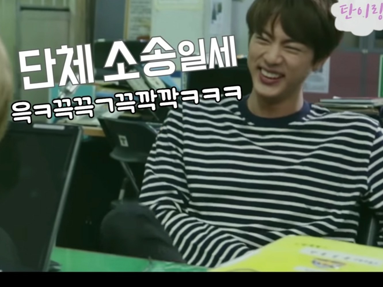 여주가 구현과 함께 복도를 걸어 석진이 기다리고 있는 휴게실로 향하고 있을때, 끅끅 거리며 웃는 석진의 웃음소리가 들려왔다.