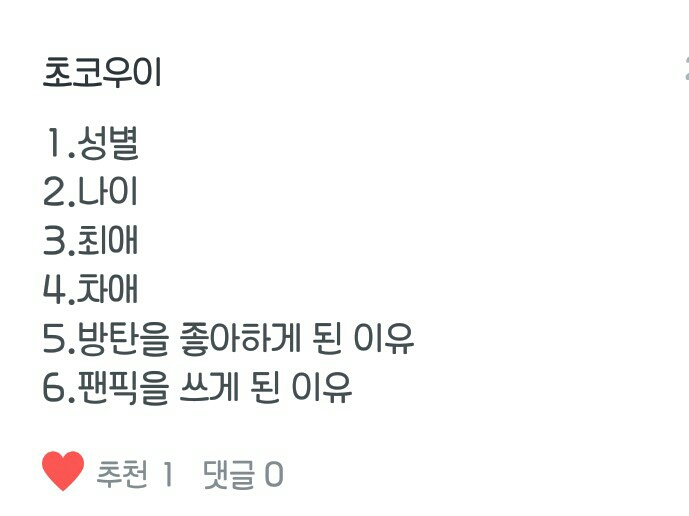 Q. 1.성별 2.나이 3.최애 4.차애 5.방탄을 좋아하게 된 이유 6.팬픽을 쓰게 된 이유 (헉..많다..)