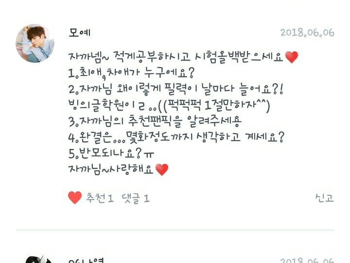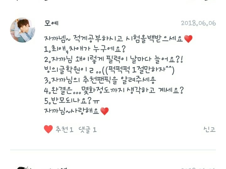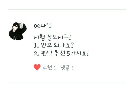 2.음..전 독자분들이 저에게 말씀해주신 자기가 쓰는 팬픽은 거의 다 보고 있고요! 인좀비와 학교종이 울리면 추천합니다!