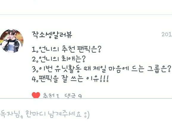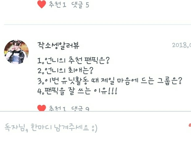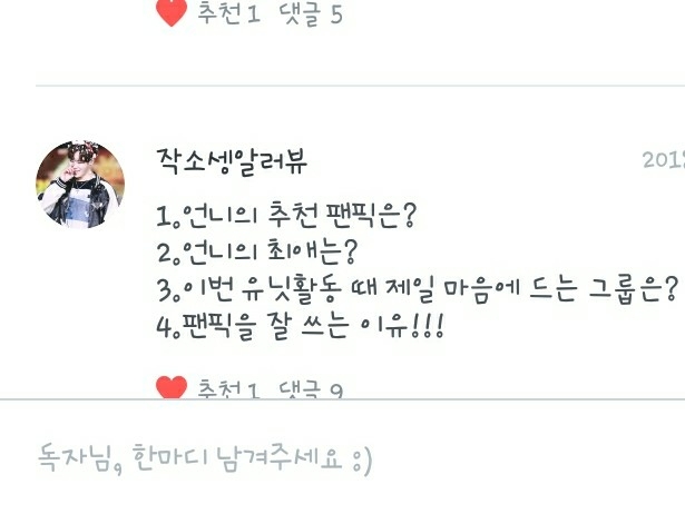 1.즐겨보는 팬픽은 음...너무 많아서... 그 독자분들 팬픽 중에서도 보는거 있고, 추천작에 있는 작품들도 많이 봐요!