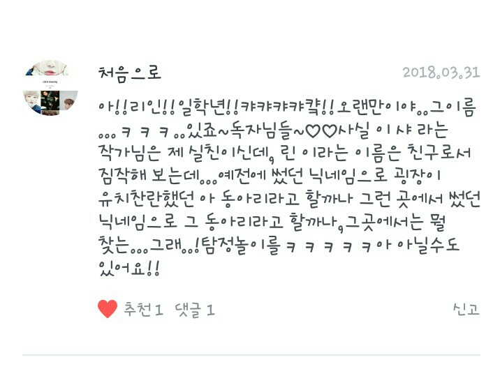 네...이분은 제 실친인데요...강다니엘에게 푹~빠져있다죠~네..이분이《유피테르》랑 《남친과 남사친의차이(?)》를 쓰셨는데 삭제했다죠...유피테르는 나중에 다시쓴다니까 한번 봐주시길...않보셔두 돼요!!!!