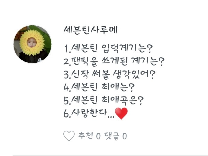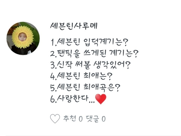 2. 팬픽을 쓰게 된 계기는... 세븐틴사루메(작가)가 글 쓰는것 보고 재밌어보여서 시작하기도 했고 사실 세븐틴작은 세븐틴사루메의 영향이 커요ㅋㅋ