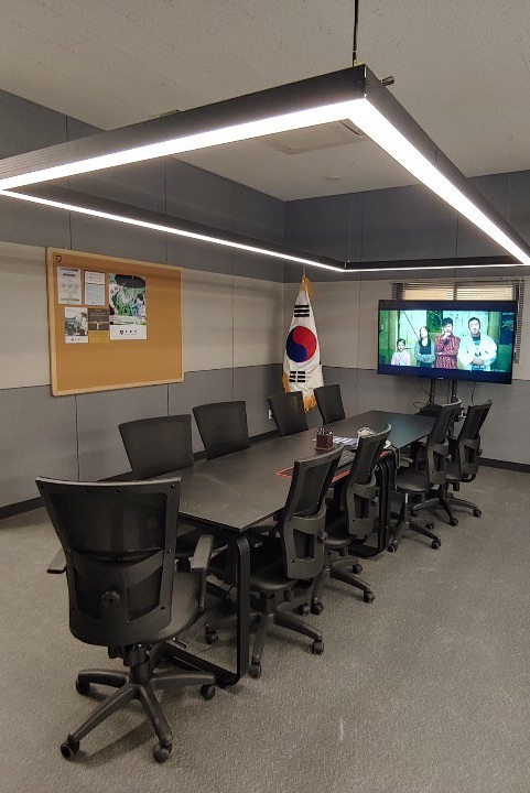 형형색깔의 불빛들이 방송을 보여주며