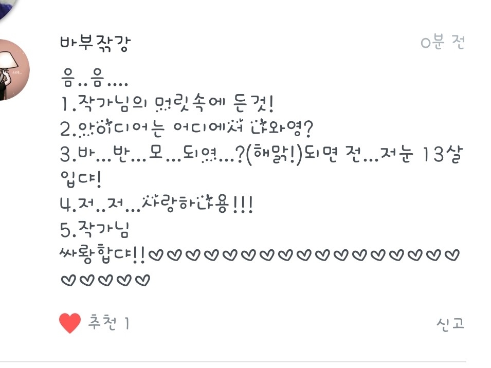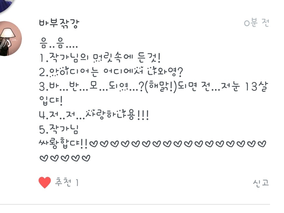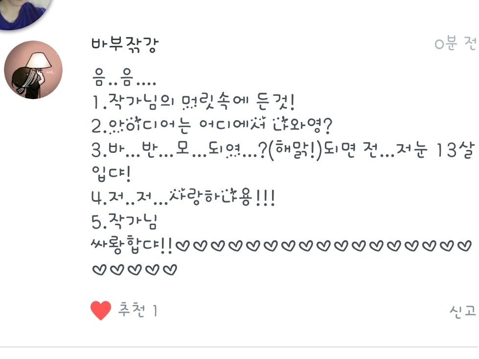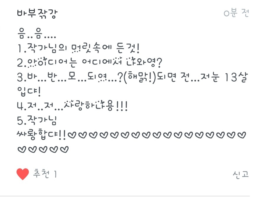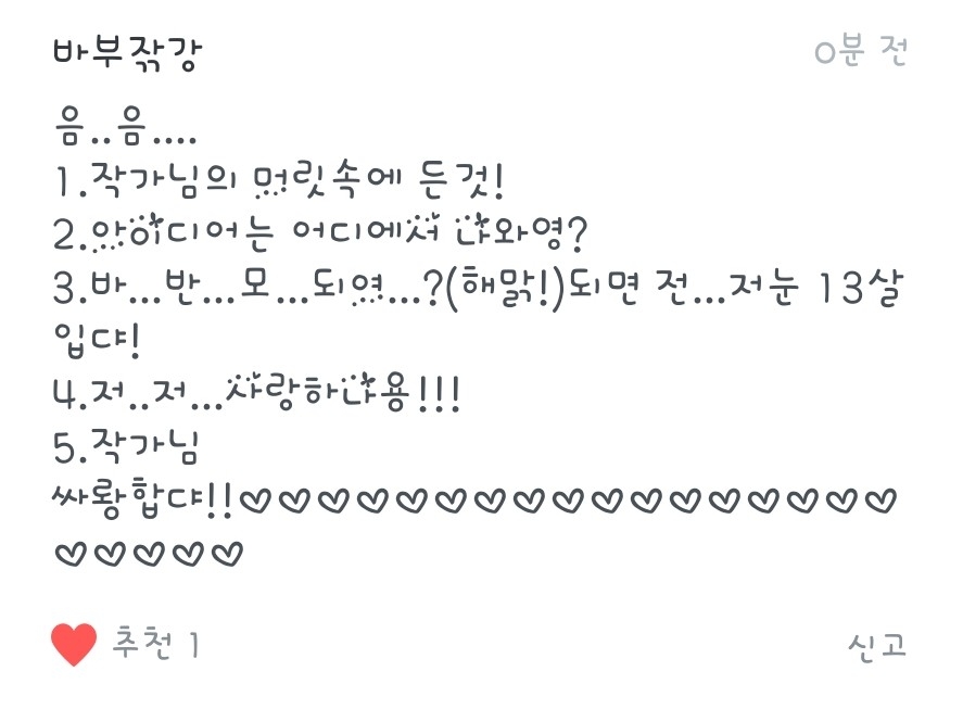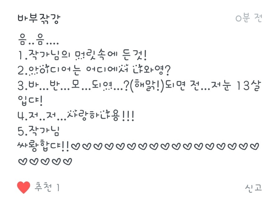3.반모되요! 15녀임니당!! 저랑 더 친하게 지내고싶으시면 옾챗으로 오시면되요!(이름은 짤랑거려버리기 입니다!)