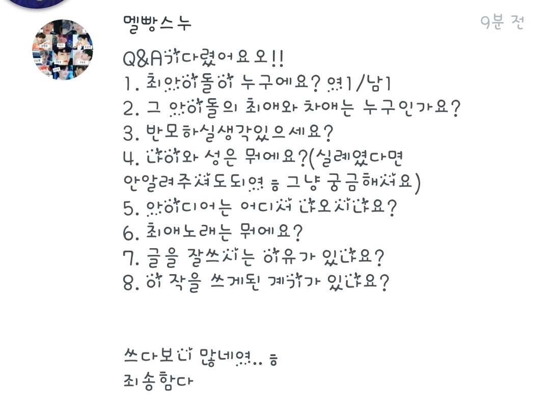 8.이 작을 쓰게된 계기라..전 얀데레물을 좋아하거든요..!한번 써보고싶었어요!ㅎㅎ😍