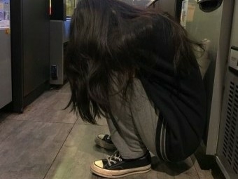 벽에 기대서 쭈그려 앉는 여주
