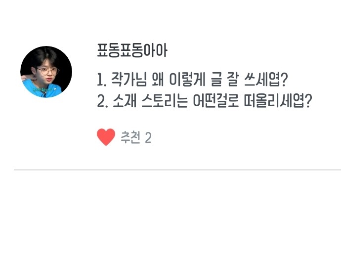 1.작가님 글 왜이렇게 잘쓰세요? / 음.. 여러분들 덕분에 힘이 나는거 아닐까요? ㅎ 항상 과분한 사랑 감사드려요 ♡