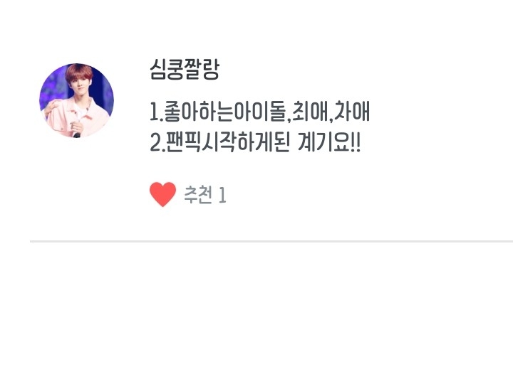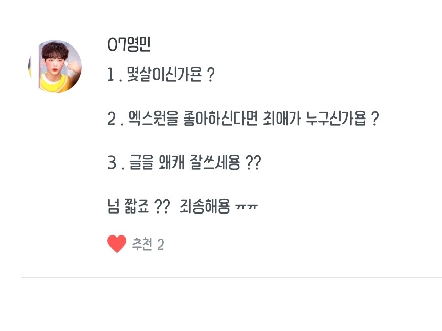 2. 엑스원을 좋아하신다면 최애가 누구신가요? / 최애는 요한님 입니다 :)