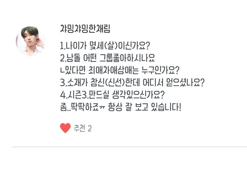 질문해주신 심쿵짤랑님, 표동표동아아님, 07영민님, 챠밍챠밍한채림님, TYCIBRIN984289661님 모두 감사드립니다 ♡