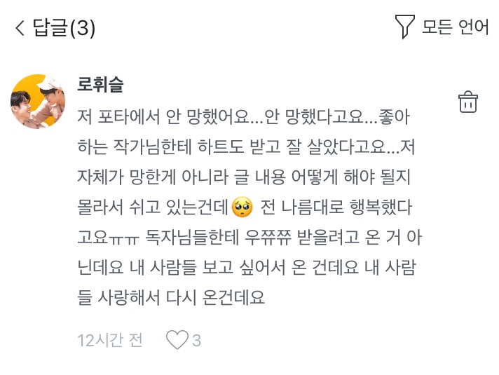 저는 절대 네버 사랑 받으려고 온 거 아니고 저 포타랑 블로그에서 안 망했고 지금이랑 비슷하게 조회수 나오고 이제 시작인데 진짜 작가님들 있는 곳에서 그만큼 나오는 건 되게 자랑스러운 일이라고 생각하고 다시 한 번 강조하는데 망해서 온 거 아닙니다