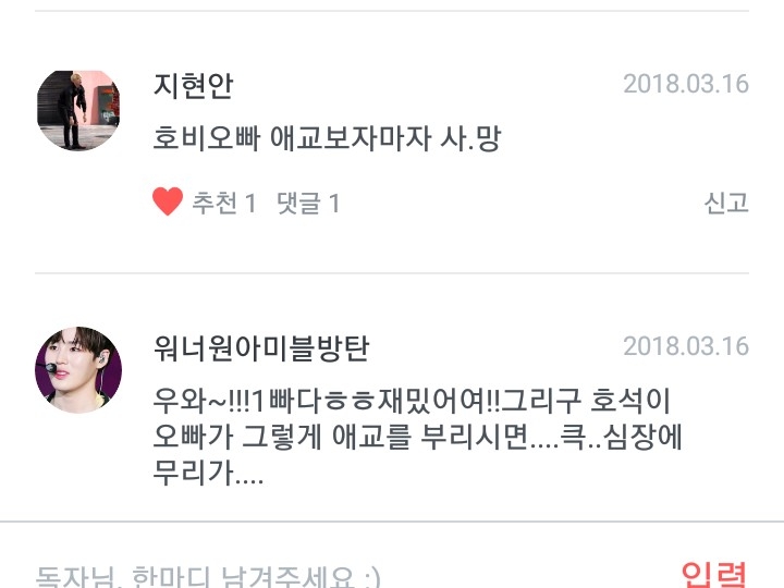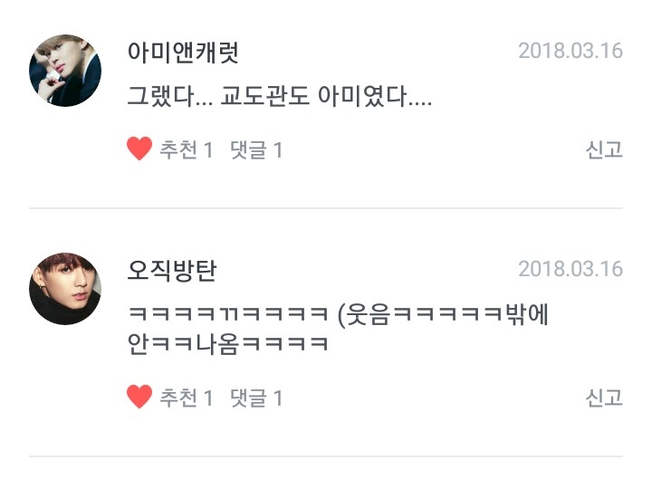 일단은!!먼저! 아미앤캐럿님!(고러타...교도관은 아미인것이 확실해 져따☆)그리구 오직방탄님!!(웃을수 있으시다니! 저의 팬픽이 조금이나마 웃음을 드릴수있으면 정말 행복하네요~!!)