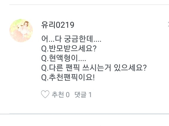 1. J'y réfléchis... euh... 2. Je suis du groupe sanguin AB. C'est détaillé. 3. Je n'en ai écrit qu'une pour l'instant, mais je compte en écrire une autre bientôt ! 4. La fanfiction recommandée est Spectacle Romance... Allez-y, jetez-y un œil !