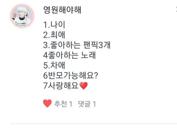 1. C'est de la graisse du ventre !!! 2. Mes préférés sont Jihoon et Minyeon ( ͡° ͜ʖ ͡°) 3. Il y en a tellement, c'est difficile de choisir... 4. Your Name is This Ending I'm in Love with Someone Else 5. Hmm... Woojin et Jaehwan... ?? (C'était la question la plus difficile...) 6. (Je réfléchis) 7. Moi aussi ♡