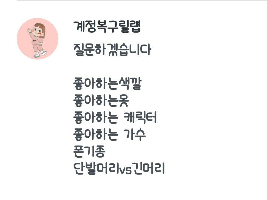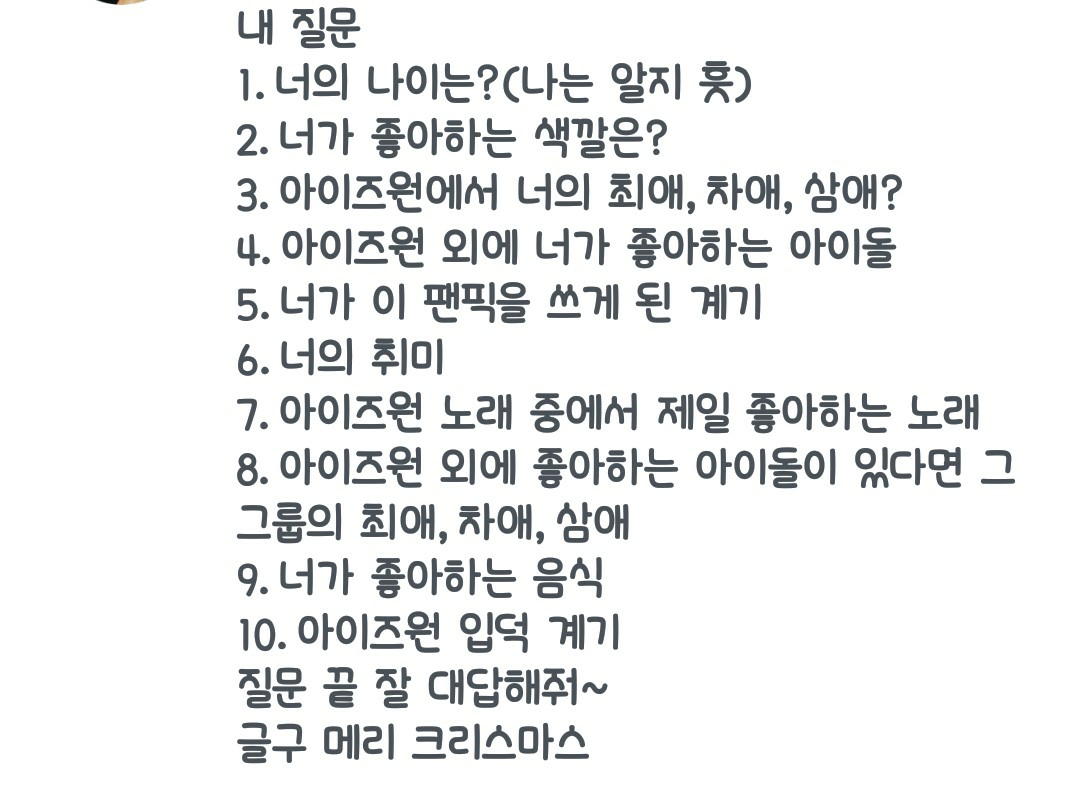 4.아이즈원외에 좋아하는아이돌은없고 레드벨벳거의 입덕할거같아요ㅎ 5.제 친구가알려줘서 쓰다보니재밌어서 하게된거같아요!. 6.저는그림그리기,액괴만지기 입니다.