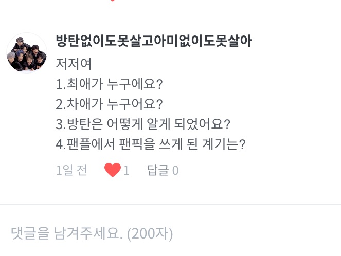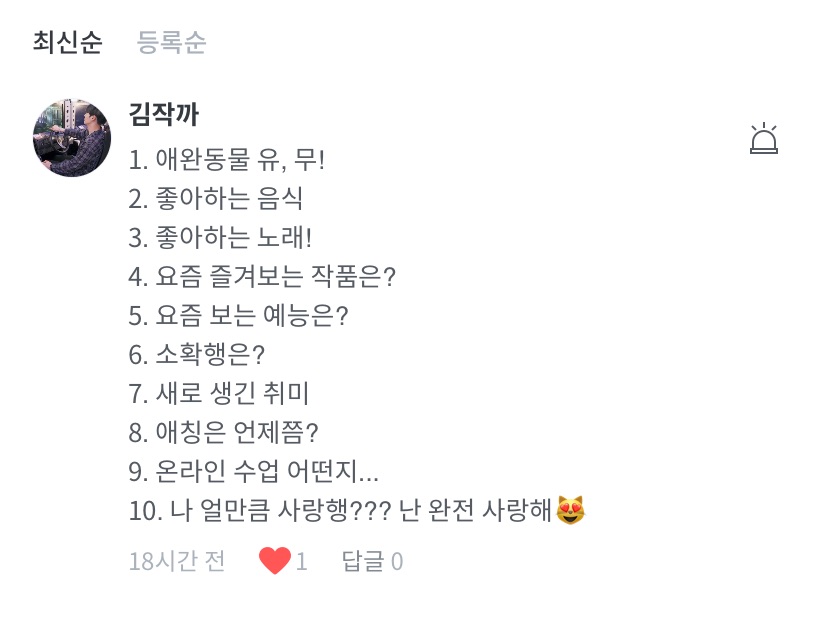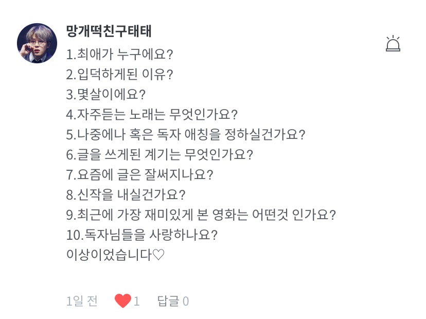 1. Quoi ! 2. Hmm… tout sauf les fruits de mer~ 3. Les chansons de BTS 4. Hmm, les œuvres auxquelles je suis abonné(e) 5. I Live Alone, Running Man, The Return of Superman, 2 Days & 1 Night, etc. 6. Téléphone portable à l’aube haha 7. Pâtisserie 8. Hmm… quand j’aurai 30 abonnés ? 9. Je déteste ça ㅠ 10. Je t’aime aussi 💜