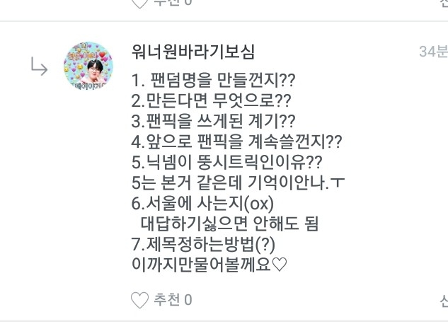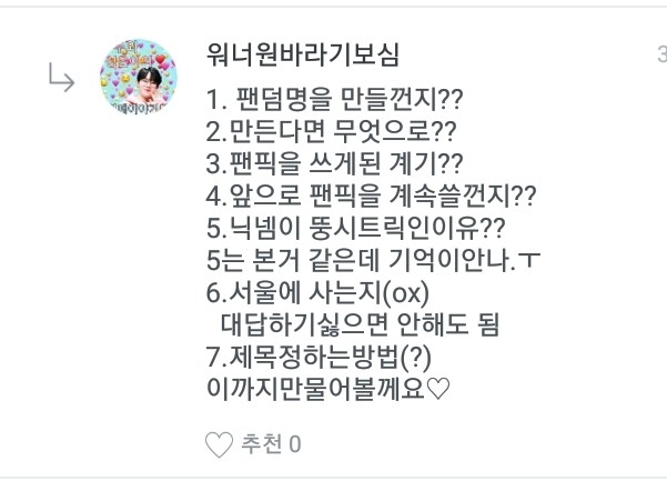 ㅇ,안녕하세요..이번에 이벤트에 당첨된 워너원바라기보심이의 질문답변후에 곧 스토리 쓸께욤..ㅎ