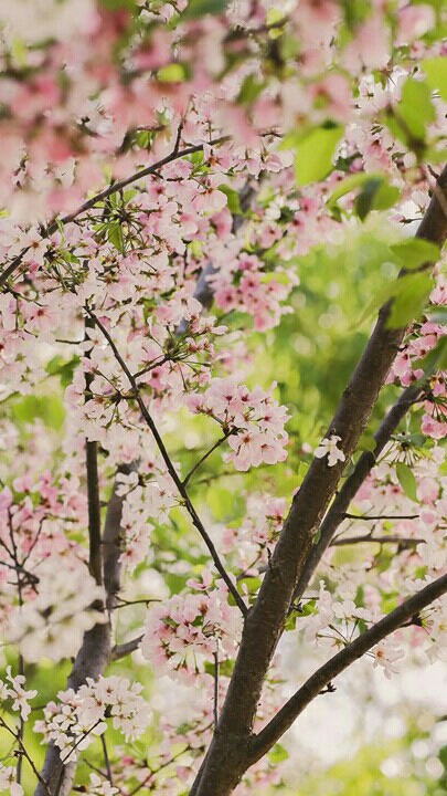 Tunas-tunas hijau juga mulai tumbuh di antara bunga-bunga sakura.