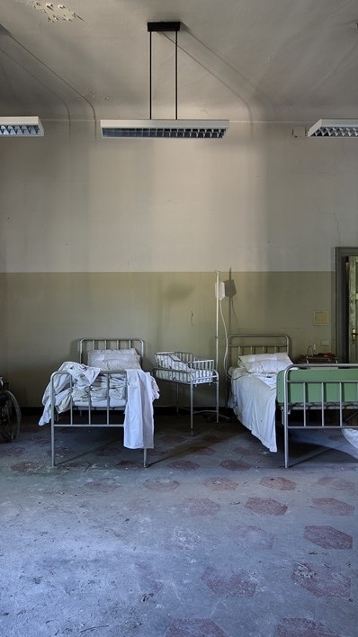 Sebuah ruang rumah sakit dengan pintu tertutup dan hanya berisi makanan dan air.
