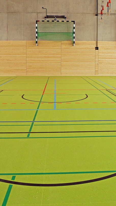 Sebuah bola melayang di atas kepala para siswa.